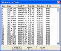 Este comando permite comparar las cotas de los puntos del dibujo con la superficie actual. En primer lugar, hay que hacer una selección de puntos (Seleccionar Puntos) y a continuación aparece por pantalla un listado con las coordenadas de los puntos seleccionados, la cota de la superficie en esas mismas coordenadas y la diferencia entre ambas.