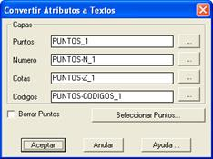 El diálogo permite especificar las capas en las que se dibujarán los Puntos y los atributos de Número, Cotay Código. Activando la casilla Borrar Puntos se consigue que se tras crear los textos, el punto original se borre del dibujo.