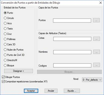 Además del tipo de entidad, hay que especificar la Capa de los Puntos que el programa debe analizar, salvo cuando se convierten bloques.