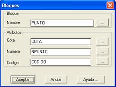 Cuando el tipo de entidad a convertir es un bloque, el botón Bloques muestra una ventana adicional donde se pueden especificar que atributos del bloque se van a tener en cuenta en la conversión. En caso de no especificarse atributos, el programa hará lo mismo que con las demás entidades, y buscara textos en las capas descritas anteriormente