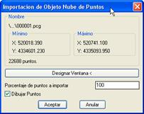 En el caso de convertir entidades de tipo nube de puntos, aparece una ventana informando de las dimensiones de la nube, y la cantidad de puntos que contiene. Se puede seleccionar una ventana menor o bien, seleccionar un porcentaje de los puntos a importar. También existe la posibilidad de no dibujar los puntos convertidos, para no recargar el dibujo.