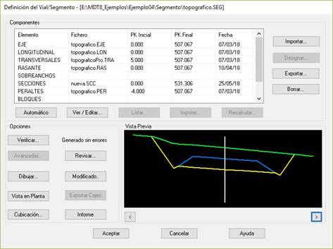 Tras activar el comando MDT solicita un fichero de segmento, el cual puede ser un fichero nuevo o bien uno ya existente. Una vez seleccionado aparecerá un diálogo como el que sigue a continuación, donde se detallan las características del segmento seleccionado, es decir, los elementos o ficheros que contiene. A continuación pasamos a describir las características de cada uno de los controles del diálogo.