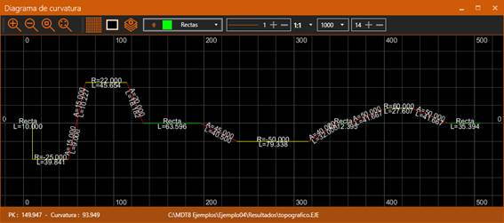 En la parte inferior de la ventana, se muestra una barra de estado que nos indica las coordenadas (en términos de PK y Curvatura) del cursor y el fichero de eje que se está mostrando.