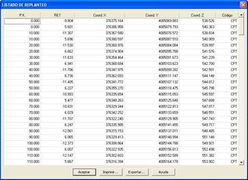 Una vez validado el diálogo MDT realiza un proceso de cálculo con los datos anteriores y presenta en pantalla un listado con la siguiente información en cada línea: PK y desplazamiento del vértice seleccionado con respecto al eje, coordenadas X,Y,Z, azimut y distancia (si se han utilizado bases de replanteo) y el código correspondiente al vértice replanteado.