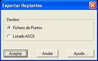 Fichero de Puntos: Se exportan las coordenadas de todos los puntos del listado a un fichero de puntos. Al validar el diálogo se ejecutará automáticamente el comando Exportar Puntos. Para más detalle consulte la sección de Puntos Topográficos.