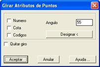 Con el comando Girar Atributos podemos representar los textos de los atributos en un sentido distinto del giro dado al dibujo, eligiendo además cuales queremos modificar. Para ello podemos especificar el Ángulo numéricamente o gráficamente mediante el botón Designar. Si lo que nos interesa es restaurar el ángulo de cada uno de los atributos a su valor original, podemos activar la casilla Quitar Giro.