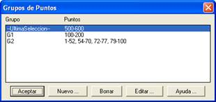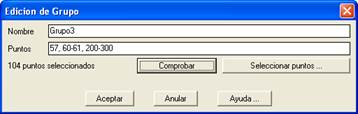 En esta ventana se asigna un nombre y se define el grupo, indicando el número de puntos separados por comas e intervalos de puntos en los que se indican los extremos separados por un guion. Mediante el botón Comprobar se verifica la sintaxis especificada, e indica los puntos encontrados. El botón Seleccionar Puntos permite acceder a la selección de puntos habitual, desplegando la ventana de Selección de Puntos.