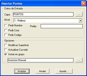 Este comando permite añadir puntos manualmente a un dibujo. En primer lugar aparece una ventana en la que se especifica la Capa en la que se van a dibujar los puntos, el Nivel al que van a pertenecer los puntos a insertar y se permite activar las opciones: Pedir Nombre, Pedir Cota o Pedir Código, de forma que tras introducir las coordenadas del punto, el programa preguntara en la línea de comandos por los atributos que se hayan activado. En caso de que exista una superficie asociada al dibujo, se puede elegir si la inserción del punto provocara una inserción de un vértice en la superficie (Modificar Superficie), y si se modificara el curvado (Actualizar Curvado). Además, con la opción Incluir en Grupo se puede incluir los nuevos puntos en un grupo de puntos.