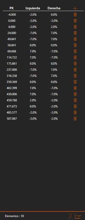 En la parte izquierda de la pantalla, se mostrarán los datos de los peraltes que están actualmente en edición. Adicionalmente, desde este mismo panel se proveerá de acceso a ciertas operaciones sobre los mismos.
