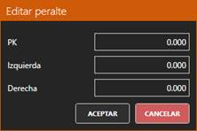Insertar: Con este botón podemos agregar nuevas definiciones de peralte estableciendo PK, Izquierda y Derecha: