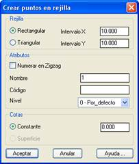 Con este comando se puede crear rápidamente un conjunto de puntos, de acuerdo a una disposición Rectangular o Triangular (también llamada tresbolillos). La ventana inicial permite especificar los intervalos X e Y de separación entre los puntos, si se quiere Numerar en Zigzag los puntos, así como el Nombre, Código y Nivel de los puntos a crear. En cuanto a la cota, hay dos posibilidades: una cota Constante, o bien, utilizar la superficie actual para dar cota a los puntos. En este último caso, los puntos de la rejilla que no proyecten verticalmente sobre la superficie no se crearán.